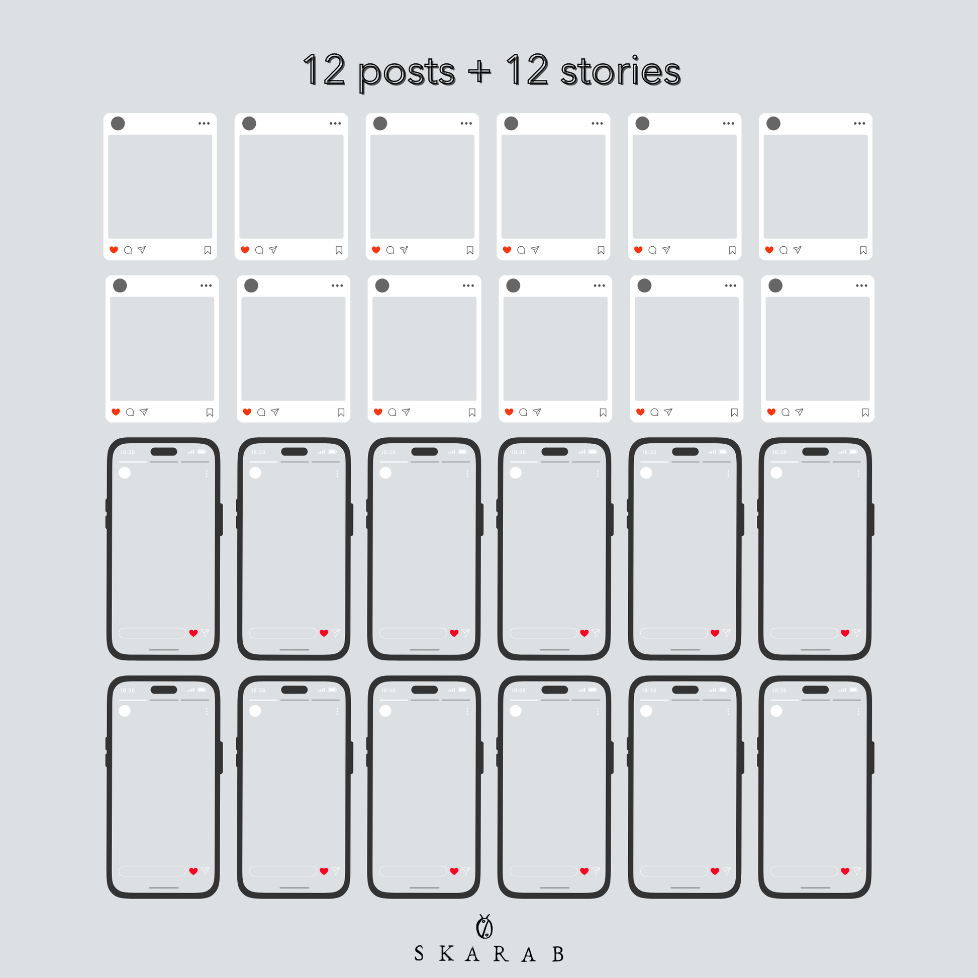 Receive 12 designs in two sizes, and accompanying captions - for posting to news feed and story feed. Batch of posts emailed to you within 7 days of placing your order. Use on Instagram, Facebook, Linkedin.